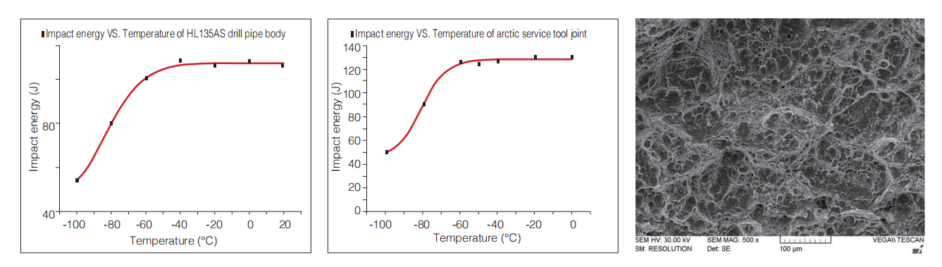 The mechanical requirements of different grades showed in the table, and the figures show the impact energy in different temperatures of HLDT-AS®135 drill pipe and the tool joint respectively:
