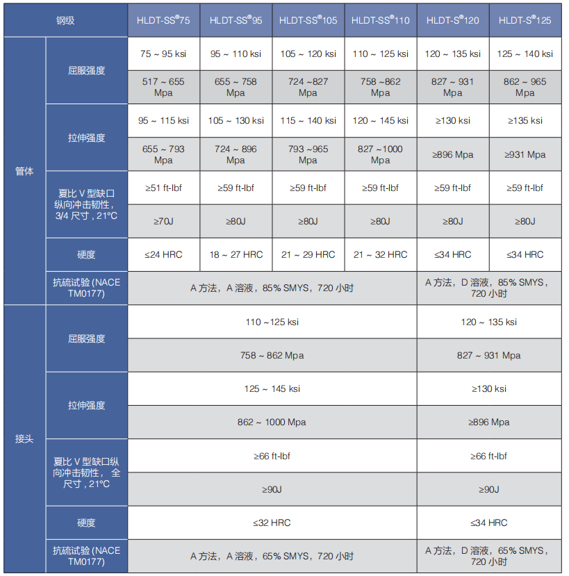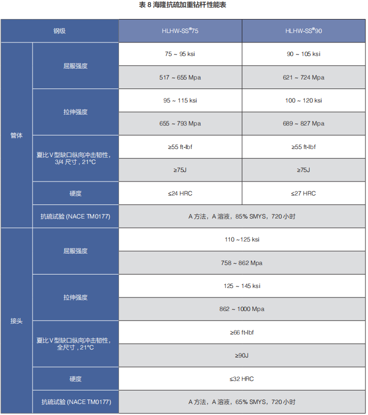 海隆抗硫加重鉆桿鋼級:HLHW-SS®75、HLHW-SS®90。