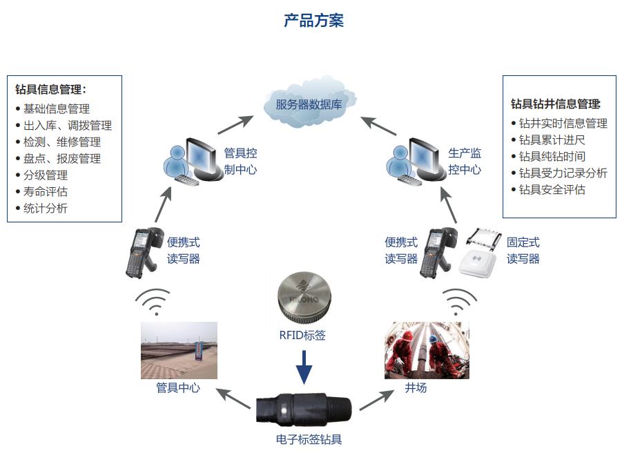 海隆電子標簽鉆具及物聯網管理系統——通過每根鉆具產品上安裝無線射頻識別(RFID)標簽,使其擁有獨一無二的“電子身份證”,結合智能讀寫設備和物聯網管理系統,高效、精確地實現鉆具生產、出入庫、調撥、使用、維修、檢測、報廢等全生命周期的管理。