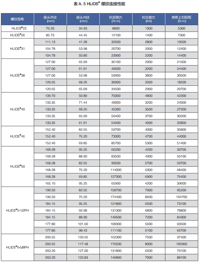 (a)HLIDS® 系列包括 HLIDS®23、HLIDS®26、HLIDS®31、HLIDS®38、HLIDS®40、HLIDS®46、HLIDS®50、HLIDS®5 1/2FH 和 HLIDS®6 5/8FH 等規格,適用于 2 3/8"-6 5/8" 所有API 標準鋼級和規格的鉆桿。